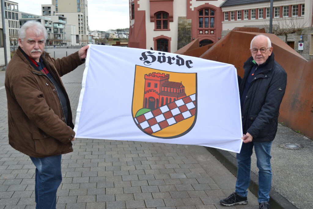 Raimund Schroeder und Bernhard Finkeldei (r) präsentieren vor der Hörder Burg die neuaufgelegte Hörde-Fahne.